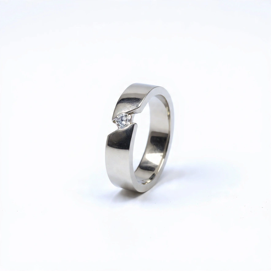 The Star Light Rift is a masterclass in minimalist luxury and structural precision. This band features a sleek, high-polish finish interrupted by a strategic “rift” that holds a single, brilliant Moissanite. Designed for those who appreciate understated elegance, it balances a bold, solid profile with the sharp, dancing fire of a premium gemstone.